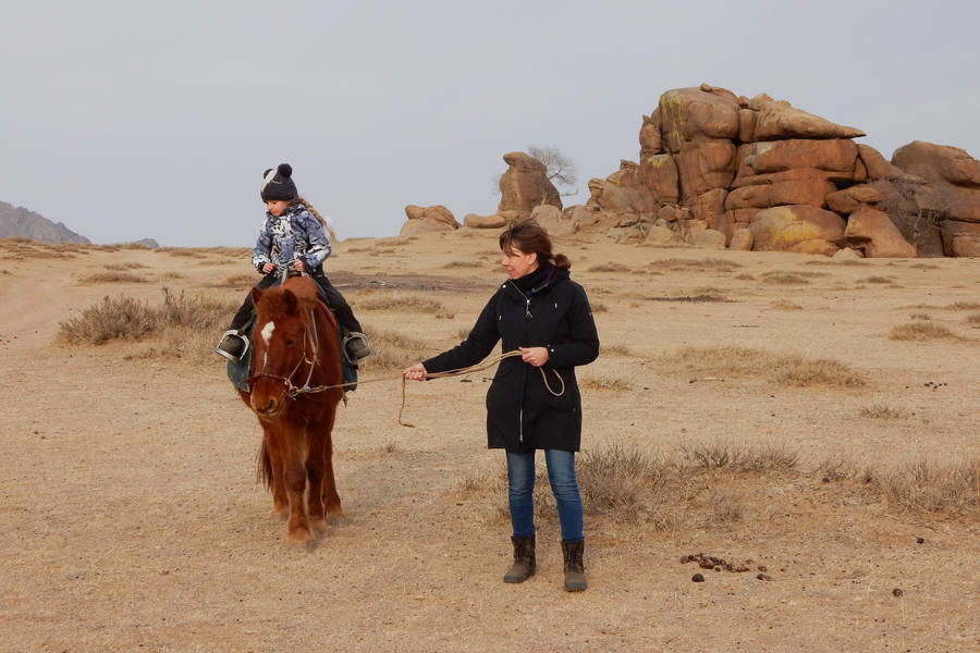 Pas mal de piste le lendemain. Nous visitons le monastère d’Erdene Khambiin en grande partie détruit par les russes entre 1934-37. Quelques temples demeurent intacts. L’endroit est très calme, arboré et rempli de sérénité. Il est aussi à quelques centaines de mètres de notre yourte, au milieu des splendides formations rocheuses de Khogno Khan. Sur place, après l’accueil traditionnel, on nous prête deux chevaux réputés calmes pour promener nos petits, qui apprécient bien la balade. Ce sera ensuite notre tour. Nous mangeons le soir une excellente soupe de nouilles avec nos hôtes, Ideree et Ramba, ainsi qu’une famille voisine en visite habitant la yourte d’à côté, à 5 kilomètres de là 🙂 . Nous filons dormir après avoir terminé la deuxième bouteille de Vodka.
