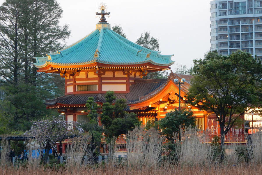 Quartier ultra moderne de Roppongi Hills. Au 52ème étage de la tour Mori, un des gratte-ciel les plus élevés de la capitale avec ses deux cent trente-huit mètres de haut, nous assistons à la tombée de la nuit avec vue sur la tour Konami et la circulation du soir. Il y a au 53eme age un intéressant musée d’art moderne et au pied de la tour, nous faisons la connaissance de «Maman», une araignée monumentale créée par l’artiste Louise Bourgeois.