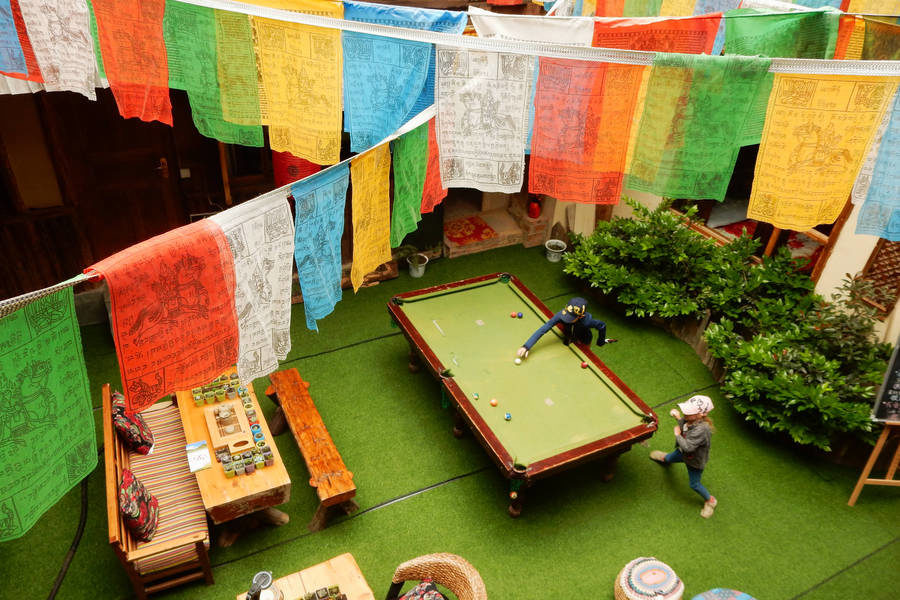 Nous avons pris le bus pendant 4 heures pour Shangri la, une petite ville dans la montagne à 3200 mètres d’altitude. Il y avait un gigantesque rouleau de prière et aussi des petits. Il était très lourd et ce n’était pas facile de le faire tourner, il fallait 10 personnes! On a vu aussi des temples bouddhistes avec des cloches et des drapeaux de prière multicolores, et des stupas blanches.