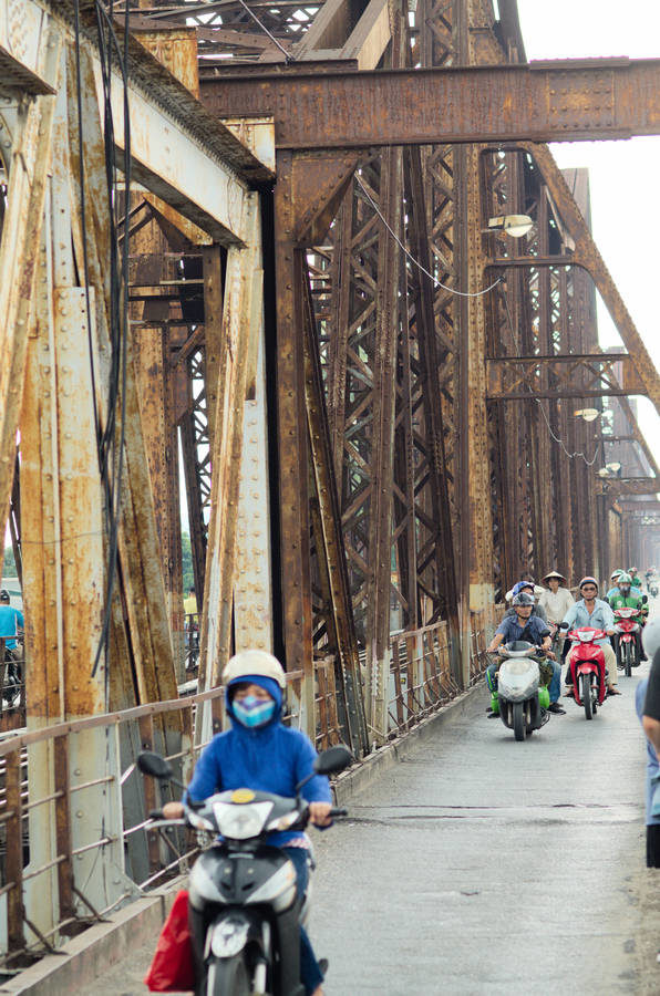 Le lendemain, nous suivrons les rails de train jusqu’au pont Long Biên. Construit en trois ans (1899-1902) par plus de 3000 travailleurs vietnamiens, il fut détruit en 1972 par les premières bombes américaines à guidage laser, après une première tentative partiellement réussie en 1967. Aujourd’hui, seule une moitié du pont est d’origine.